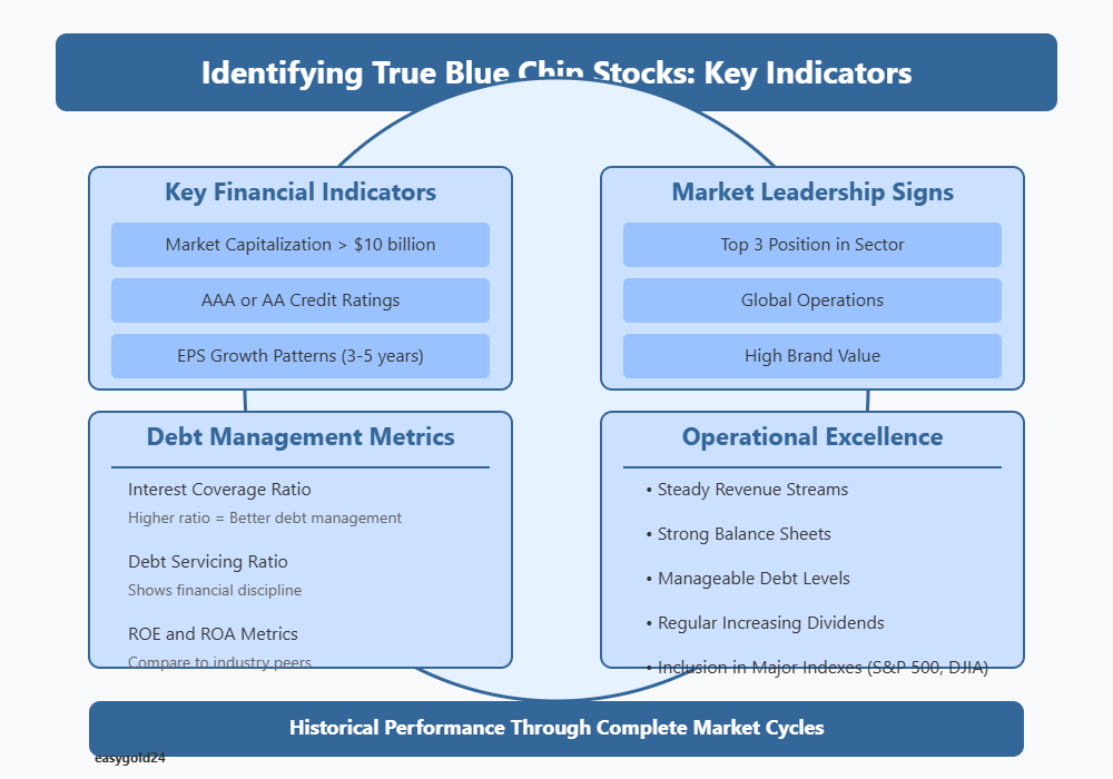 Identifying genuine blue chip stocks requires a systematic approach that focuses on specific financial metrics and market indicators. These key factors help you recognize companies that truly deserve the blue chip designation.