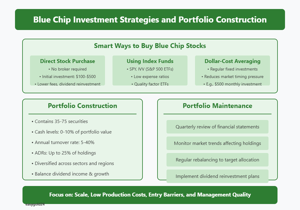 Portfolio Construction Fundamentals: A well-structured blue chip portfolio typically contains 35 to 75 securities. Cash levels should remain between 0-10% of total portfolio value, with annual turnover rates from 5-40%. American Depositary Receipts (ADRs) can constitute up to 25% of holdings to provide international exposure.