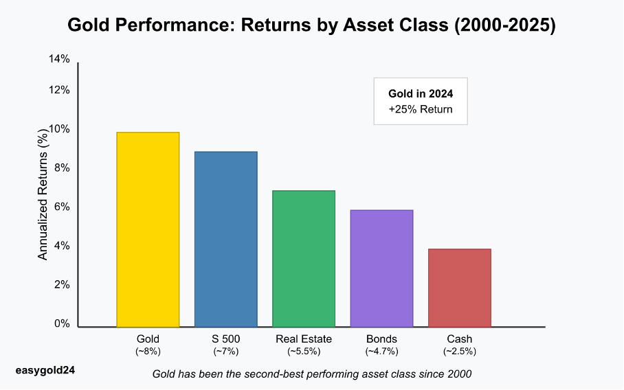 Gold remains one of the most reliable asset classes, delivering nearly 8% annualized returns since 2000. With a current price of $2,990 per ounce and a 25% gain in 2024 alone, it continues to outperform as both an inflation hedge and a store of value. Most financial professionals recommend allocating 5–10% of liquid assets to physical gold as part of a diversified portfolio.