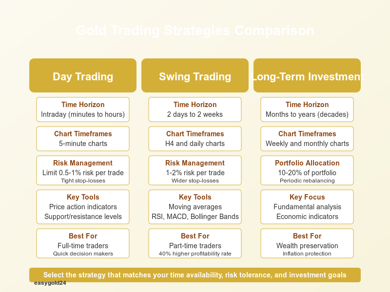 Swing trading gold represents a middle ground between day trading and long-term investing, with positions held from two days to two weeks. This strategy offers several advantages: