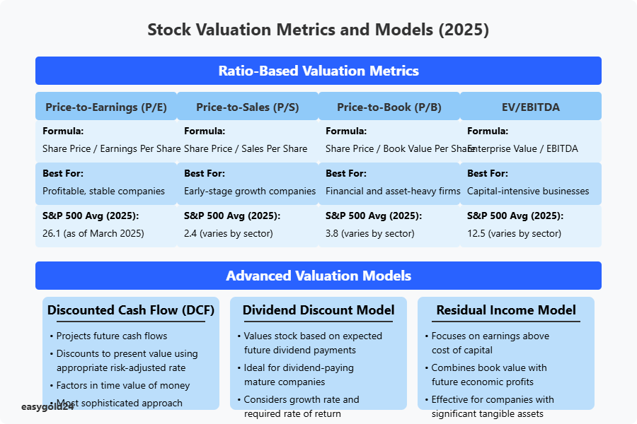 Valuation metrics and models provide investors with quantitative frameworks to assess a stock’s intrinsic value relative to its market price. The Price-to-Earnings (P/E) ratio remains one of the most widely used valuation metrics, comparing a company’s share price to its earnings per share, with the current average P/E ratio for S&P 500 companies at 26.1 as of March 2025. Other essential valuation ratios include Price-to-Sales (P/S), Price-to-Book (P/B), and Enterprise Value-to-EBITDA (EV/EBITDA), each offering unique perspectives on a company’s relative valuation compared to its peers and historical averages.
